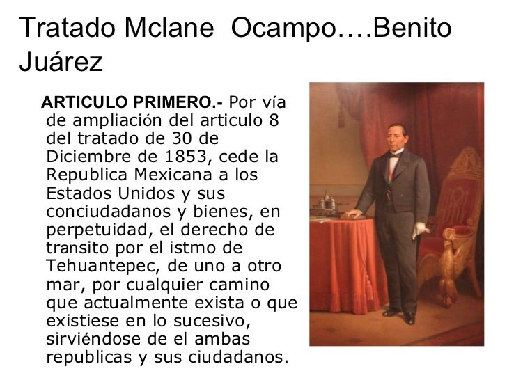 21-abr-2024. El Tratado firmado por los ministros McLane y Ocampo en diciembre de 1859, y que debía ratificarse seis meses después, contemplaba el libre comercio de una serie de mercancías y el derecho de tránsito por el istmo de Tehuantepec; de Guaymas a Nogales, y de Matamoros a Mazatlán, (caminos señalados en azul en el mapa.