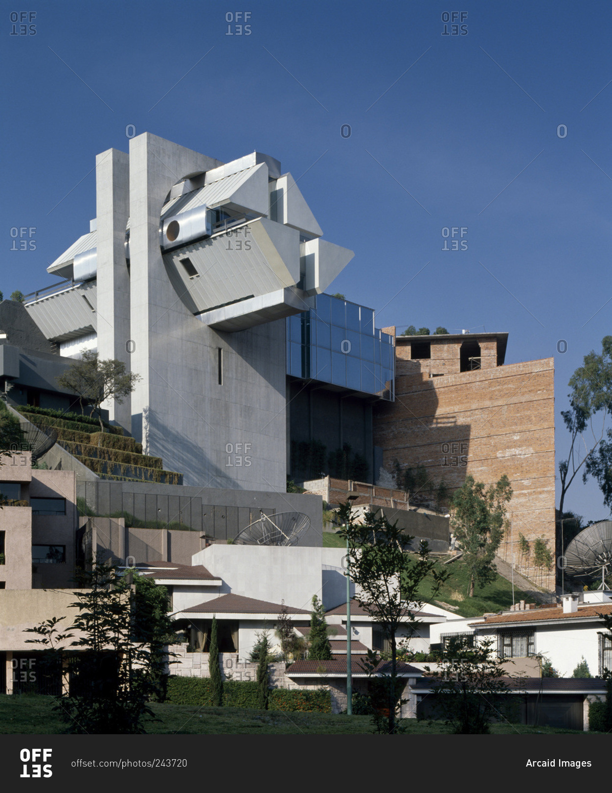 Imagen: Archdaily. Dentro de sus obras más destacadas está la Casa del Aire, construida en 1991. Ubicada en Bosques de las Lomas, este edificio resalta tajantemente de su contexto. Dos imponentes muros que nacen de una loma de gran pendiente, son atravesados por un prisma romboidal que parece fugarse al infinito. La casa ronda entre lo brutalista y lo ultramoderno.