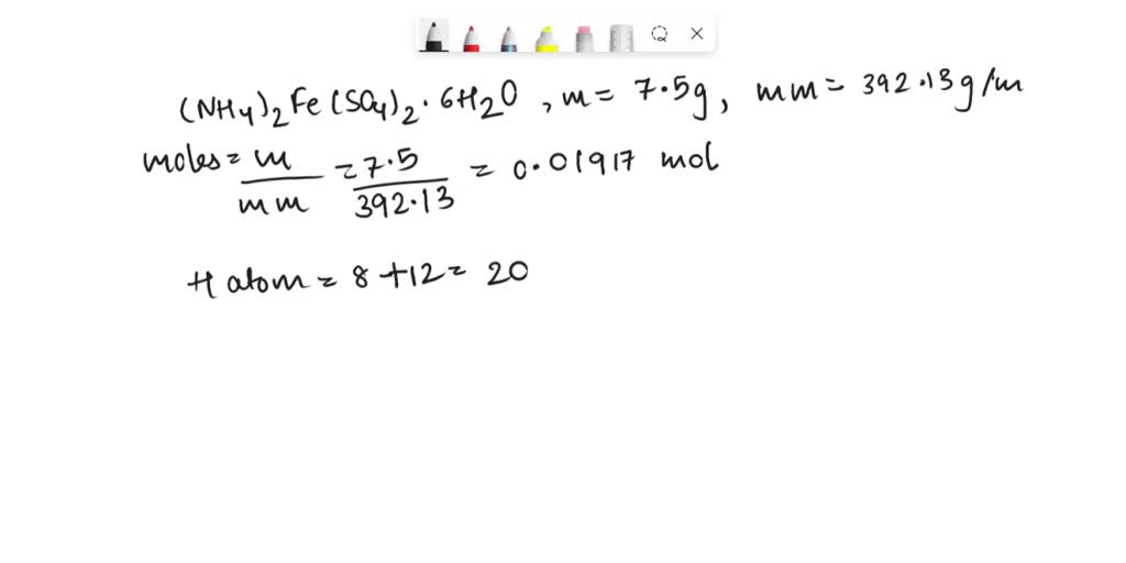 SOLVED How many hydrogen atoms are there in 7.50g of (NH4)2Fe(SO4)2 · 6H2O?