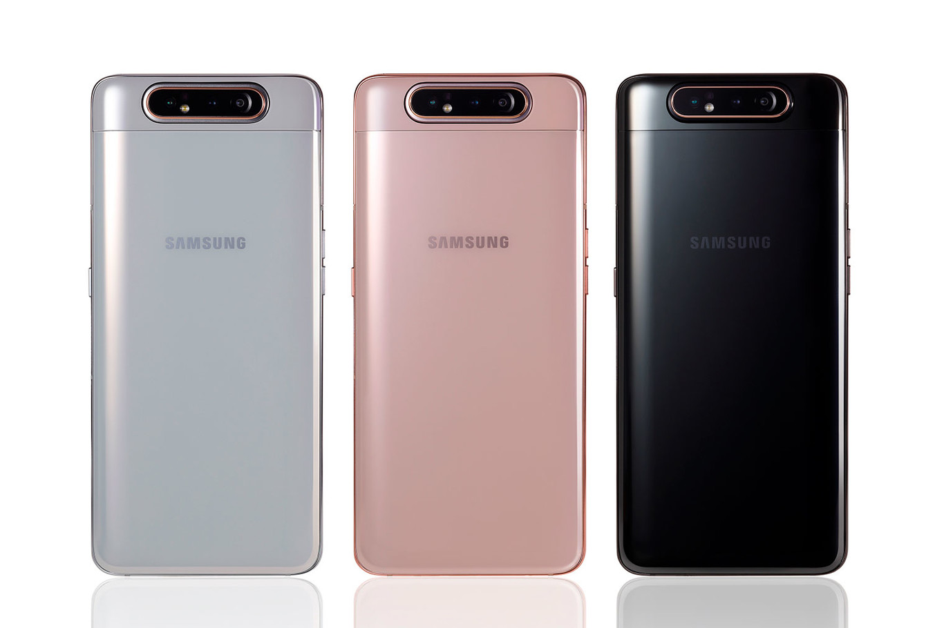 Samsung Galaxy A80 Android smartphone. Announced Apr 2019. Features 6.7″ display, Snapdragon 730 chipset, 3700 mAh battery, 128 GB storage, 8 GB RAM, Corning Gorilla Glass 3.
